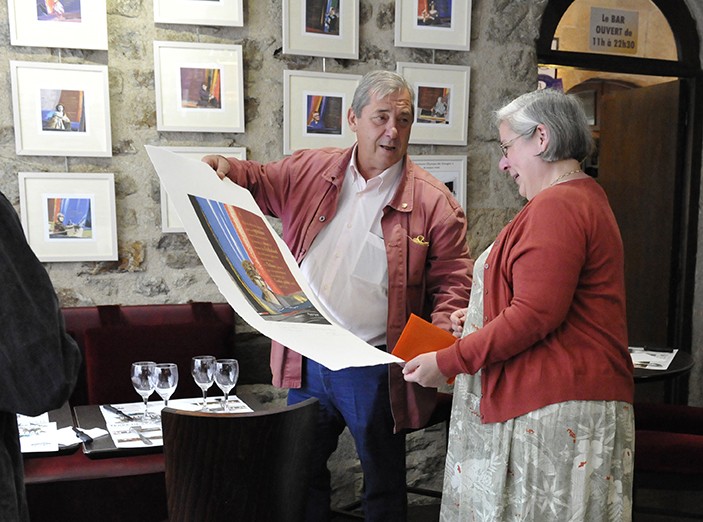 Madame Claire O’Mahony et l’artiste Jacques Fadat à la terrasse de l’Hôtel de France